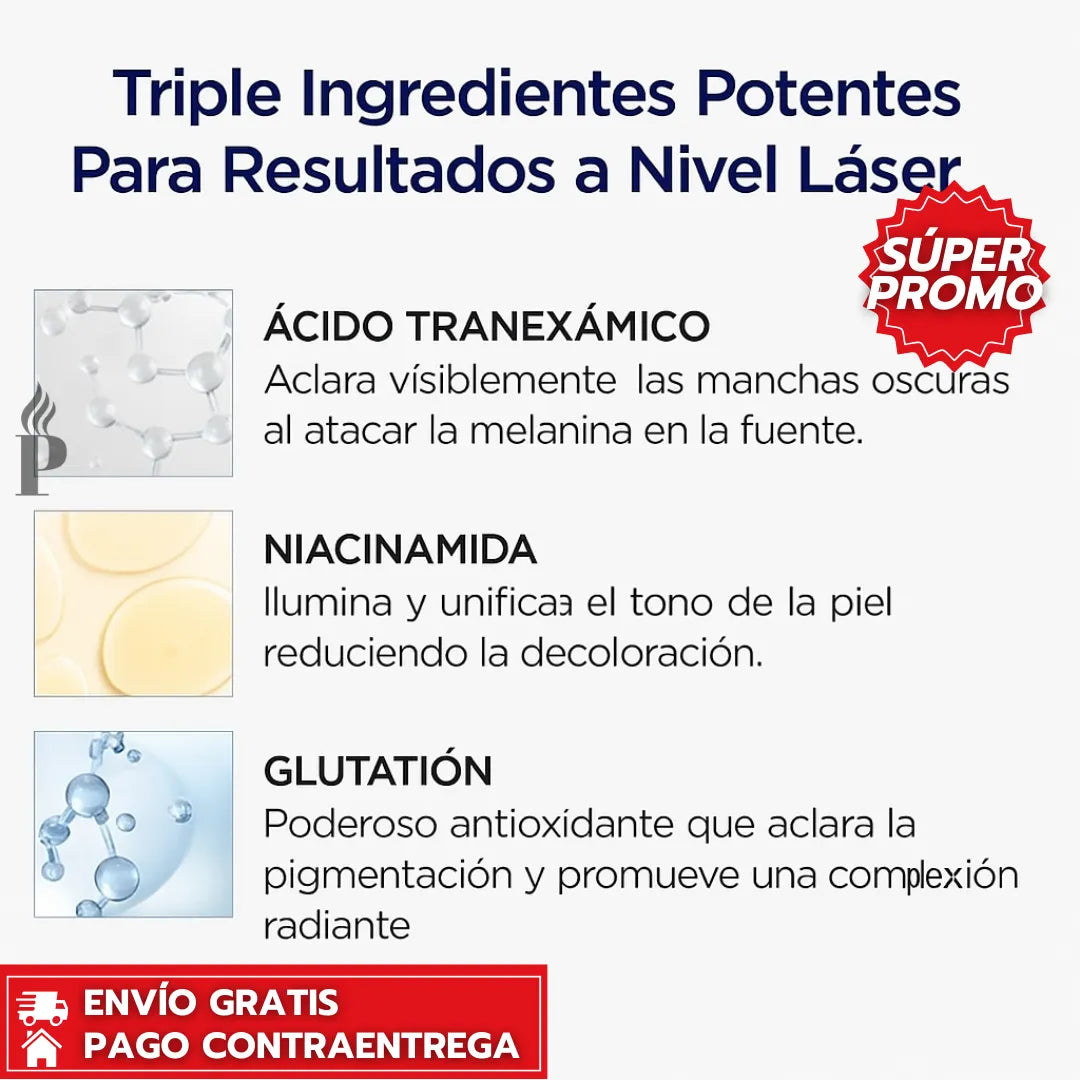 ➡️ Ácido tranexámico: Mejora la apariencia de las pecas y equilibra el tono de la piel.➡️ Niacinamida: Reduce manchas por la edad y mejora la textura cutánea.➡️ Ácido hialurónico + péptidos: Hidratación profunda y mayor elasticidad.